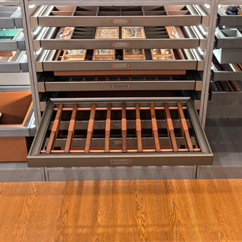 ตะกร้าอลูมิเนียมแบบดึงทรงตื้นอุปกรณ์เสริมสำหรับตู้เสื้อผ้าพร้อมถาดแบนสำหรับเลื่อนหนังอุปกรณ์เสริมตู้เสื้อผ้า